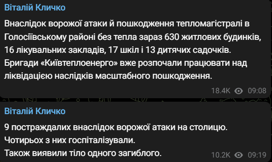 Мэр столицы Виталий Кличко сообщил, что один человек погиб и 9 пострадали в результате ракетной атаки.