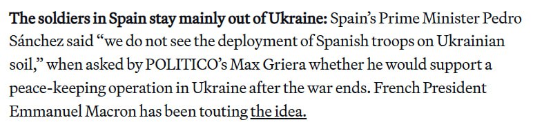 Военные Испании не будут участвовать в миротворческих силах на линии разграничения между Россией и Украиной, заявил премьер-министр страны Педро Санчес.