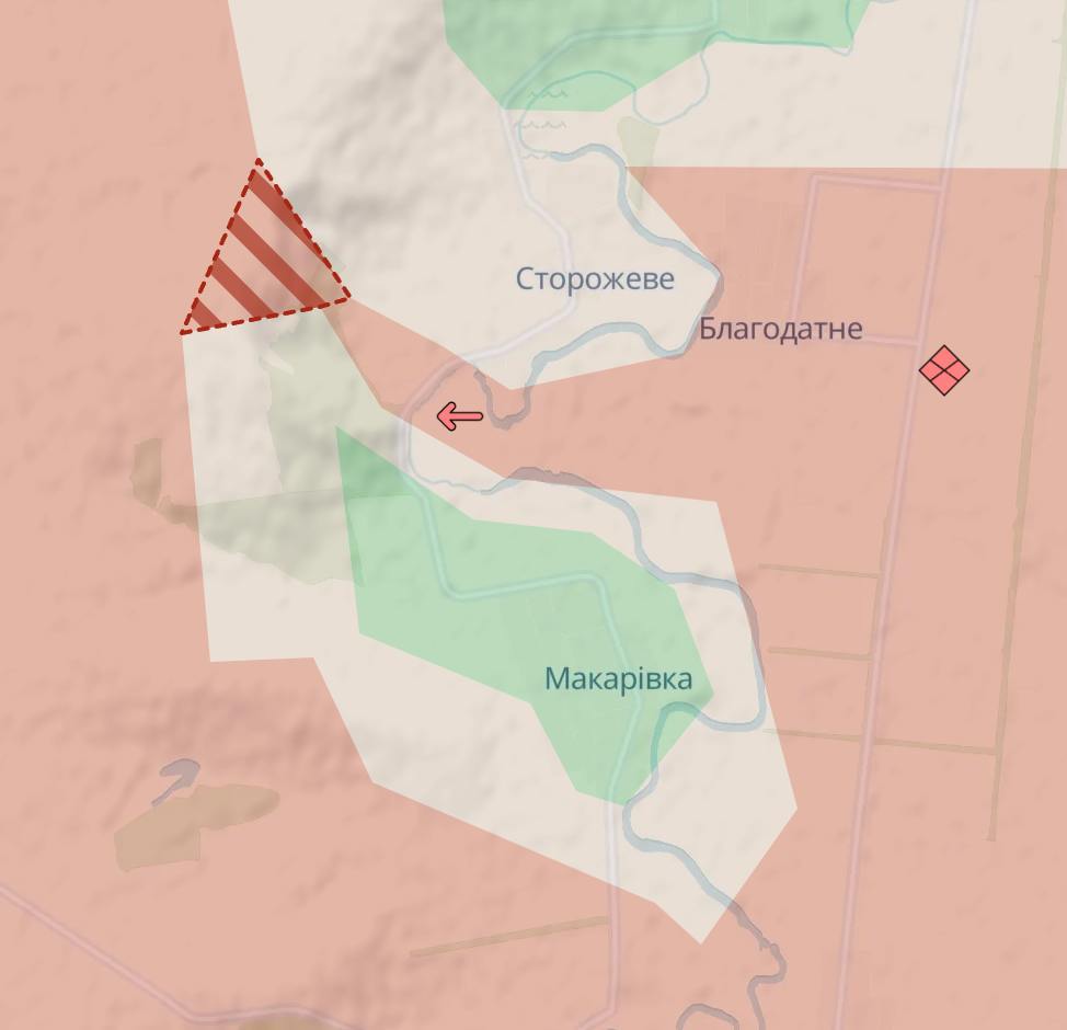 Российские паблики заявляют, что армия РФ захватила и расположенное севернее Макаровки Сторожевое (на карте Deep State указано как серая зона).