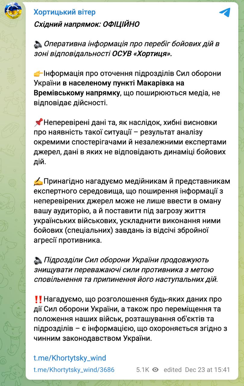 "Информация об окружении подразделений Сил обороны Украины в населенном пункте Макаровка на Времевском направлении, распространяемая медиа, не соответствует действительности. Непроверенные данные и, как следствие, ошибочные выводы о наличии такой ситуации – результат анализа отдельными наблюдателями и независимыми экспертами источников, данные в которых не соответствуют динамике боевых действий", - заявляет группировка "Хортица".