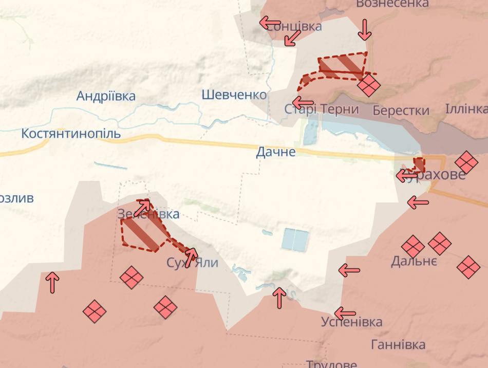 Также армия РФ продвинулась в Курахово и под Покровском. В частности, захвачены сёла Зеленовка и Сухие Ялы под Курахово.