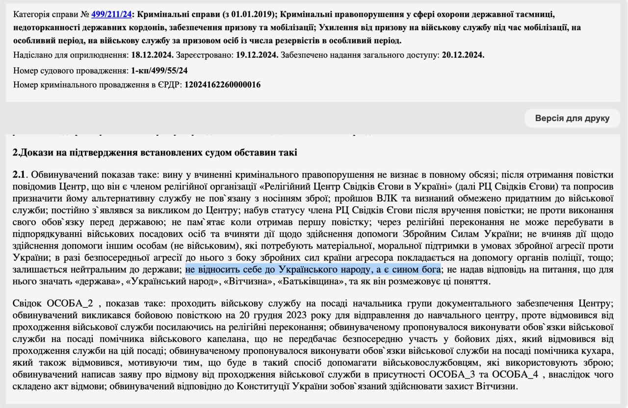 Ивановский районный суд Одесской области приговорил к 3,5 годам тюрьмы инженера лицея и члена организации "Свидетели Иеговы", отказавшемуся от мобилизации из религиозных соображений. Он заявлял, что считает себя "нейтральным к государству, не относит себя к украинскому народу, а является сыном бога".