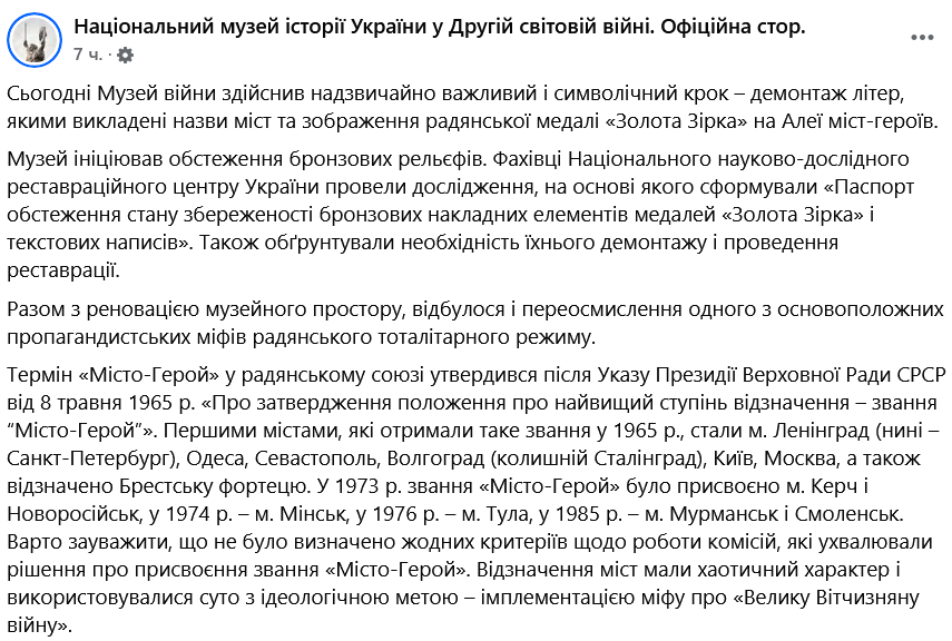 В сообщении говорится, что сотрудники музея начали обследование бронзовых рельефов на аллее городов-героев. На основе исследования специалисты Национального научно-исследовательского реставрационного центра Украины сформировали "Паспорт обследования состояния сохранности бронзовых накладных элементов медалей "Золотая Звезда" и текстовых надписей" и аргументировали необходимость демонтажа и реставрации.