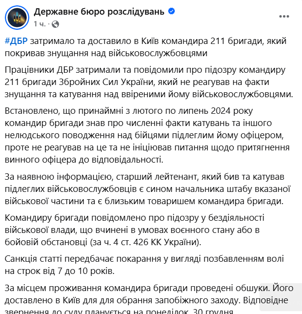 Были проведены обыски по месту жительства командира бригады. Ему сообщено о подозрении в бездействии военной власти, совершенном в условиях военного положения или в боевой обстановке (по ч. 4 ст. 426 УК Украины).