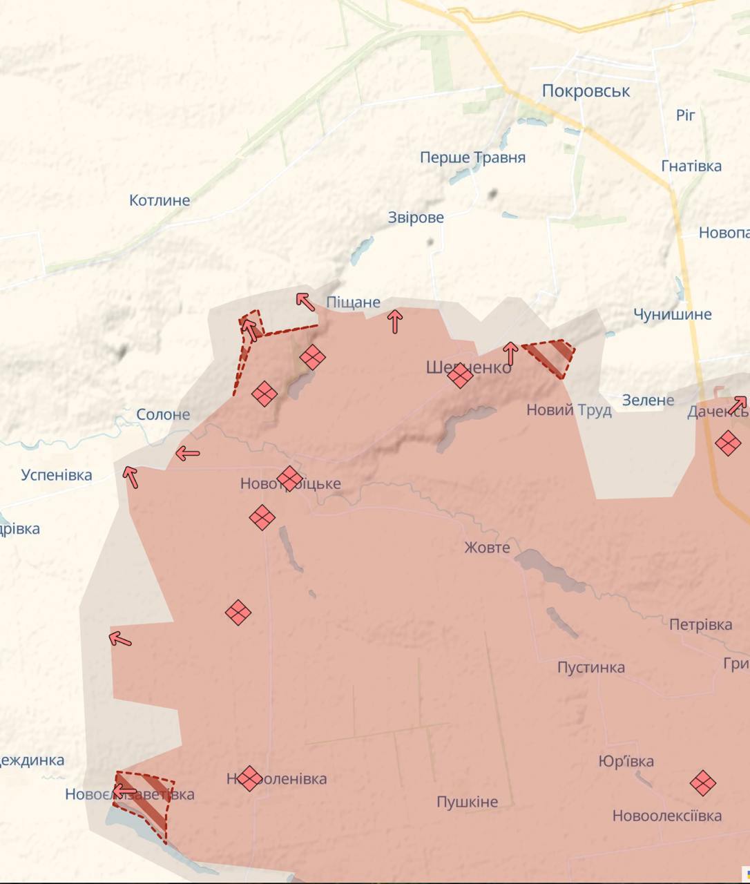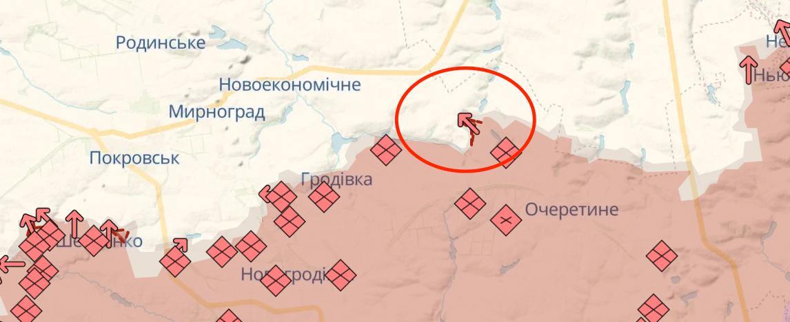 Под Покровском заметно продвижение в направлении села Котлино, которое расположено на трассе, ведущей из Покровска на юго-запад (также по этой трассе располагается село Удачное, где находится последняя подконтрольная Украине шахта с коксующимся углём).