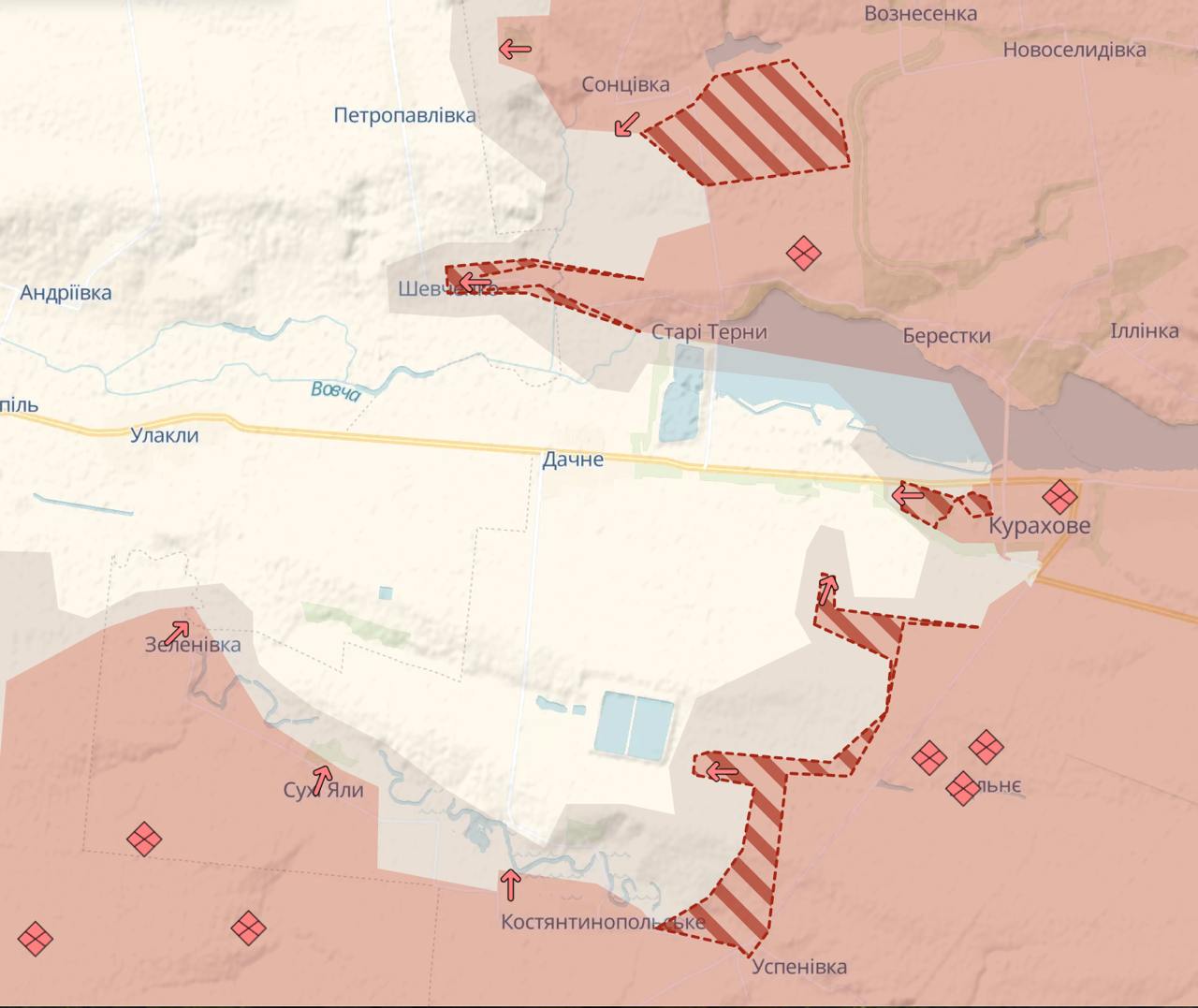 Лейтенант ВСУ Алекс пишет, что россияне здесь "закрепились на противоположном от Тернов берегу водохранилища в селе Ивановка".