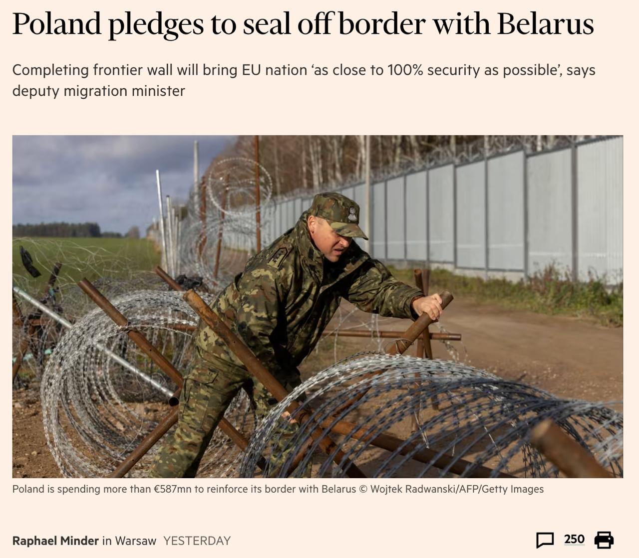 Как сказано в заметке, к следующему лету Польша намерена завершить строительство пограничной стены и закрыть границу с Беларусью, чтобы остановить приток мигрантов, который Варшава называет гибридной войной России.