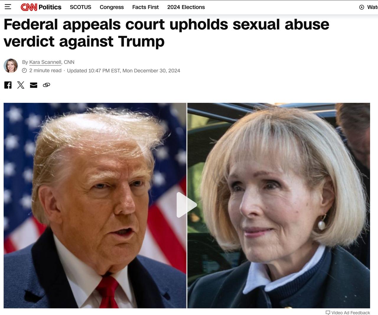 Избранный президент США Дональд Трамп проиграл апелляцию по обвинению в сексуализированном насилии в отношении 81-летней писательницы Элизабет Джин Кэрролл.