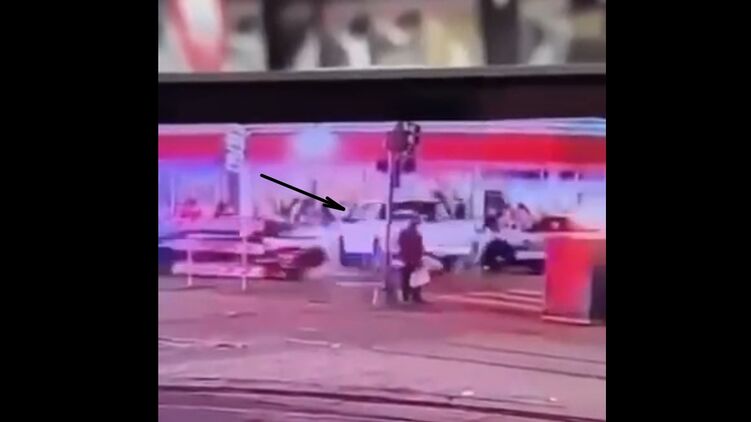 На кадрах видно, как белый крупногабаритный пикап, двигающийся по загруженной городской улице в какой-то момент сворачивает на парковочную территорию перед торговым центром, где врезается в пешеходов, делая разворот по второстепенной дороге.