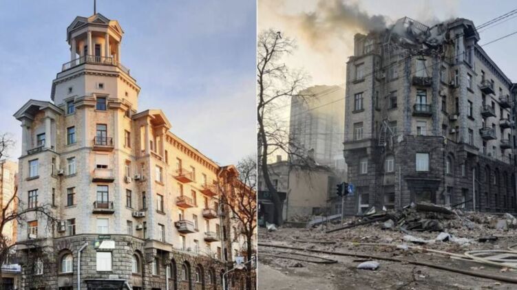 "Дом Совнаркома" в Киеве до и после удара "Шахеда"