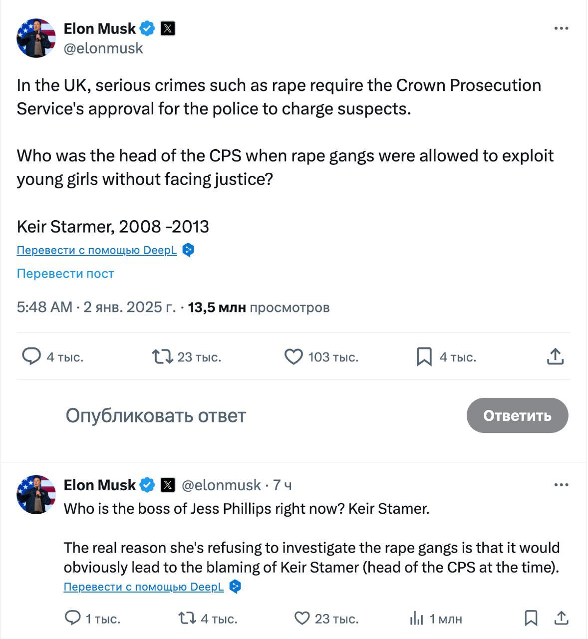 Отвечая на одно из сообщений о новом опросе, свидетельствующем о падении поддержки лейбористского правительства Стармера, Маск призвал провести повторные выборы.