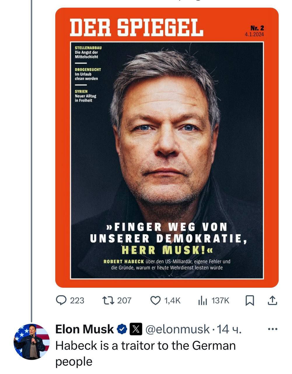 Так он прокомментировал заявление Хабека о самом Маске. "Руки прочь от нашей демократии, господин Маск", - заявил вице-канцлер.