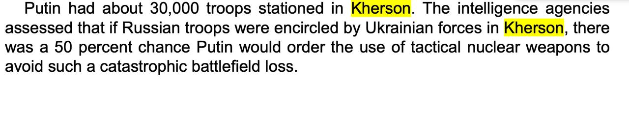По данным Вудворда, осенью 2022 года разведка донесла Белому дому, что в случае угрозы разгрома российских войск на правобережье Херсонской области Путин может применить тактическое ядерное оружие.