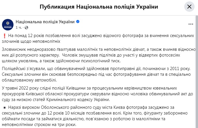 Известный киевский фотограф Александр Ктиторчук получил более 12 лет тюрьмы за изнасилования несовершеннолетних и съемку с ними порнографии.