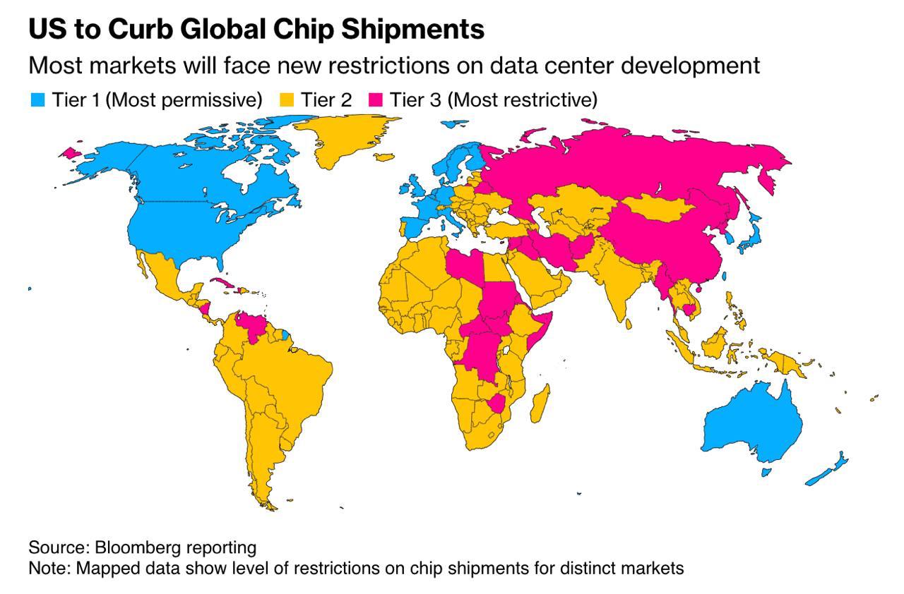 По информации издания, лишь небольшое число союзников США сохранят неограниченный доступ к американским чипам. Такие страны вошли в первую группу по доступности чипов (см. карту). В ней находятся всего 19 стран. Для остальной части мира предлагается ввести лимит на количество вычислительной мощности для каждой страны. Наиболее жесткие ограничения введут для третьей группы из 20 стран, в которую входят Россия и Китай.