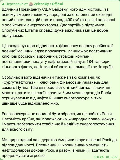 Владимир Зеленский поблагодарил администрацию уходящего президента США Джо Байдена и его лично за новые санкции против российских нефтегазодобывающих компаний.
