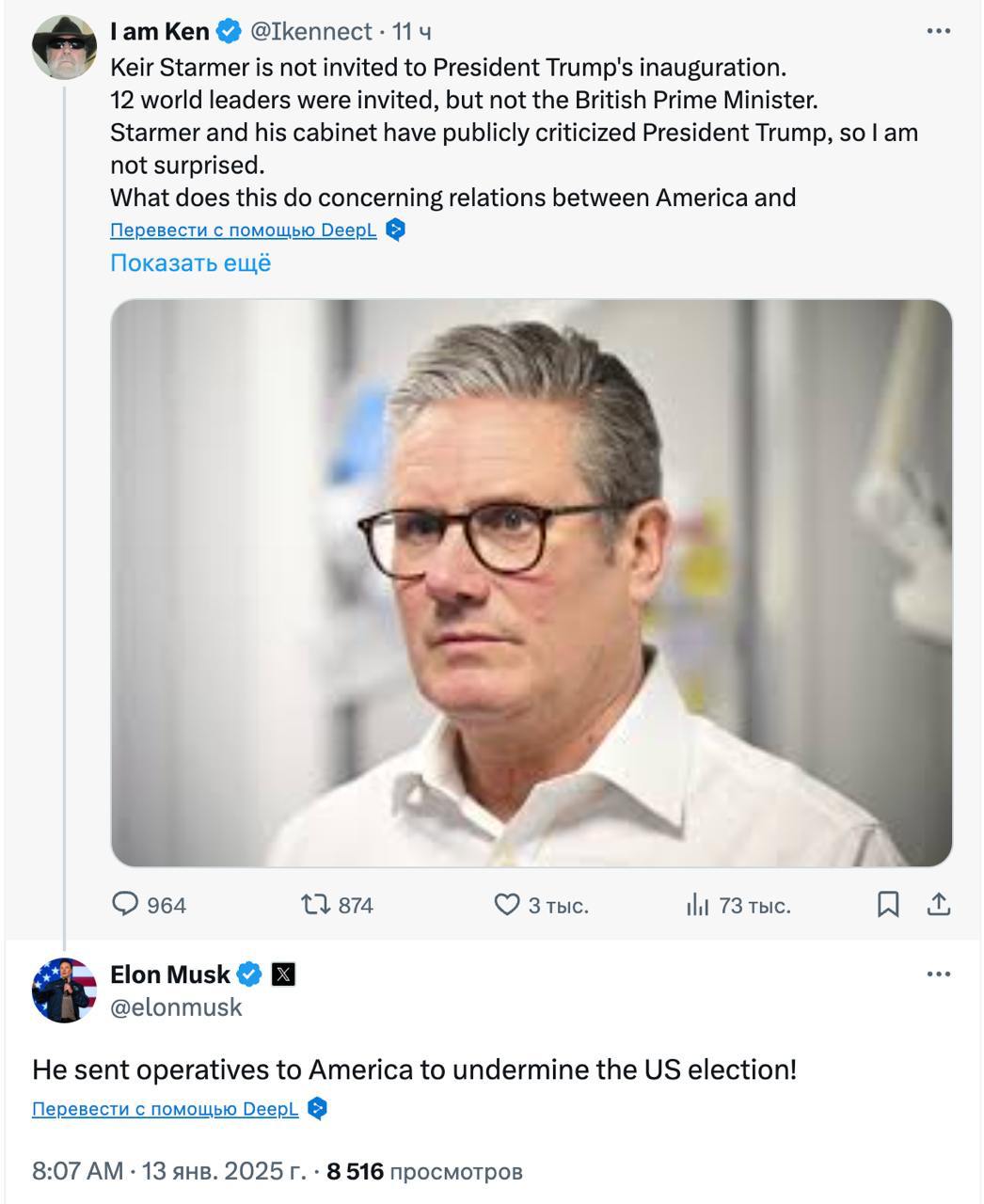 Так предприниматель из команды избранного президента США Дональда Трампа прокомментировал публикацию в Х о том, что Стармера не пригласили на инаугурацию.