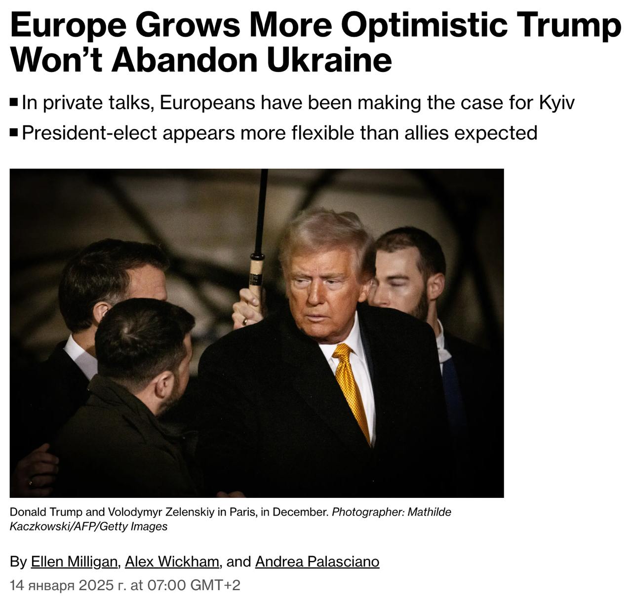 Европейцам показалось, что Трамп может помочь Украине войти в переговоры с позиции силы, но наверняка они не знают, что будет делать президент после инаугурации. Планировщики Трампа предлагают ему несколько идей, но плана действий за неделю до инаугурации все еще нет. Однако европейцы уже не так боятся худшего сценария со склонением Украины к быстрой и невыгодной сделке.