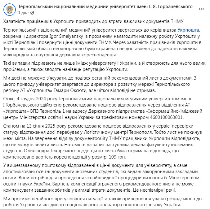 "Тернопольский национальный медицинский университет обращается к руководству "Укрпочты", в частности, ее директору Игорю Смелянскому с просьбой наладить надлежащую работу "Укрпочты" в городе Тернополь и вернуть ценные документы ТНМУ. Из-за халатности работников "Укрпочты" в Тернопольской области неоднократно утрачивали и не доставляли адресатам важную международную и внутреннюю государственную корреспонденцию... Мы до сих пор не можем выяснить, где делось последнее заказное письмо с документами. По этому поводу университет обращался к директору развития сети Тернопольского региона АО "Укрпочта" Тамаре Оксюте, но четкого ответа не получил", - сказано в публикации.
