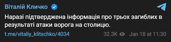 14:00 В настоящее время подтверждена информация о троих погибших в результате атаки РФ на Киев, уточнил мєр столицы Виталий Кличко.