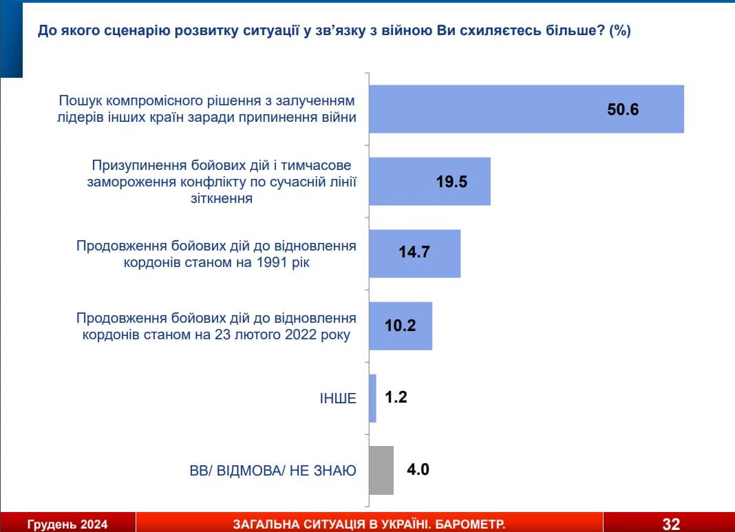 В декабре прошлого года 50,6% опрошенных заявили, что выступают за "поиск компромиссного решения с привлечением лидеров других стран для прекращения войны". В октябре было 49,4%, в сентябре 40,4%, а в феврале 36,1%.