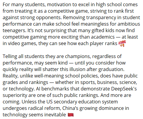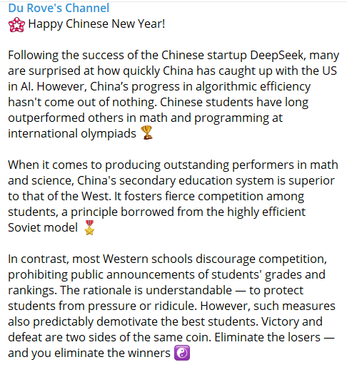 "Прогресс Китая в эффективности алгоритмов не возник из ничего. Китайские школьники уже давно превосходят других по математике и программированию на международных олимпиадах. Когда дело доходит до подготовки выдающихся исполнителей в математике и науке, система среднего образования Китая превосходит западную. Она поощряет жесткую конкуренцию среди студентов. Напротив, большинство западных школ не поощряют конкуренцию, запрещая публичные объявления оценок и рейтингов учеников. Обоснование понятно - защитить учеников от давления или насмешек. Однако такие меры также предсказуемо демотивируют лучших учеников. Победа и поражение - две стороны одной медали. Устраните проигравших - и вы устраните победителей", - пишет Дуров.