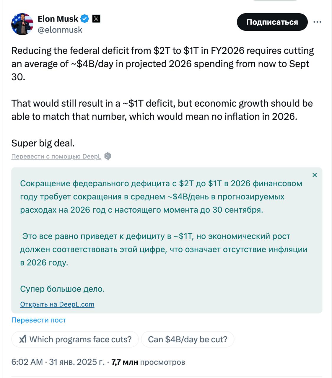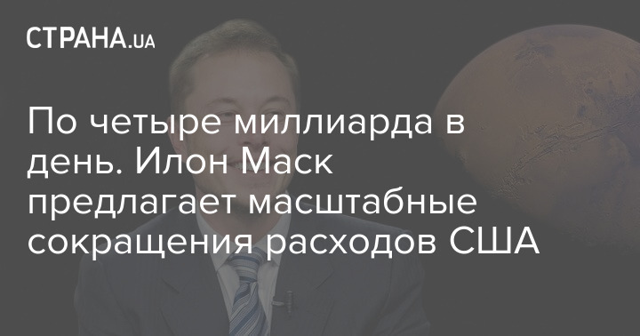 Миллиардер и глава созданного Трампом Департамента государственной эффективности планирует сократить расходы США на 4 млрд долларов в день, чтобы снизить дефицит с двух до одного триллиона долларов.