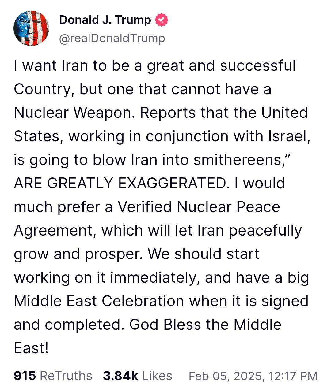 "Я бы предпочел верифицированное ядерное мирное соглашение, которое позволит Ирану мирно расти и процветать. Мы должны начать работать над ним немедленно и устроить большой ближневосточный праздник, когда оно будет подписано и завершено", - сказано в публикации.