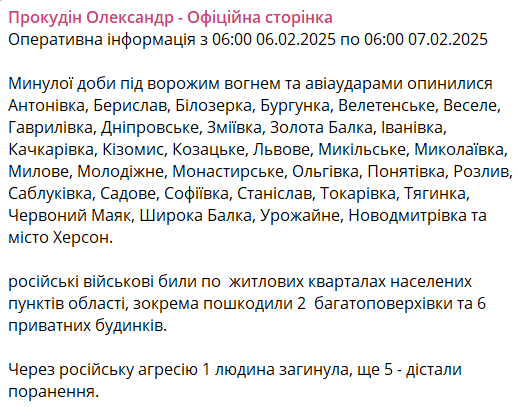 07:50 В Херсонской области за прошедшие сутки из-за обстрелов РФ один человек погиб, еще 5 - получили ранения, сообщает глава ОВА Александр Прокудин.