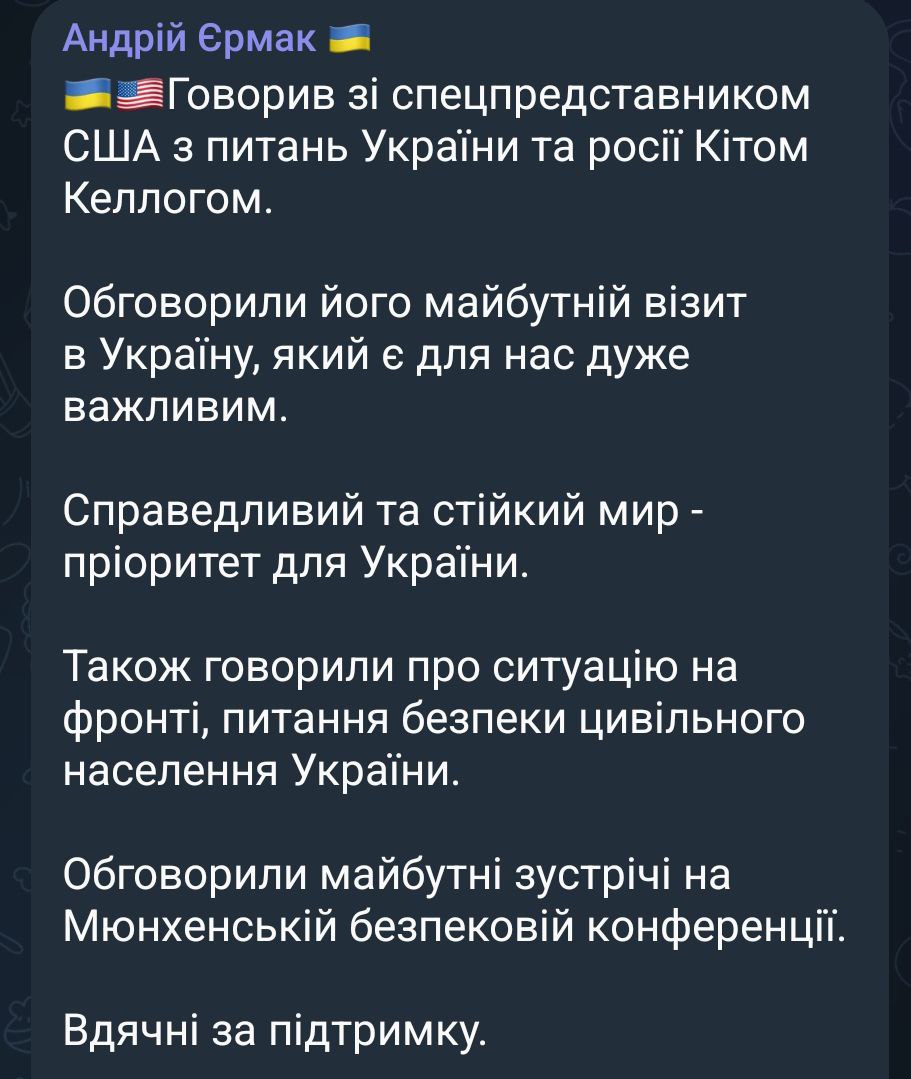 08:34 Глава Офиса президента Андрей Ермак тоже поговорил с представителем Трампа по Украине Келлогом.