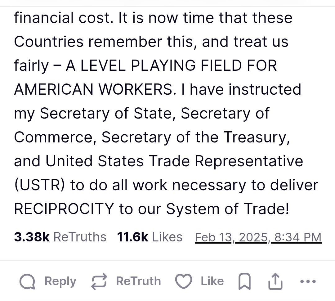 "Что касается торговли, то я решил, в целях справедливости, установить взаимный тариф, означающий, что какие бы страны ни взимали плату с Соединенных Штатов Америки, мы будем взимать ее с них – ни больше, ни меньше", – написал он.