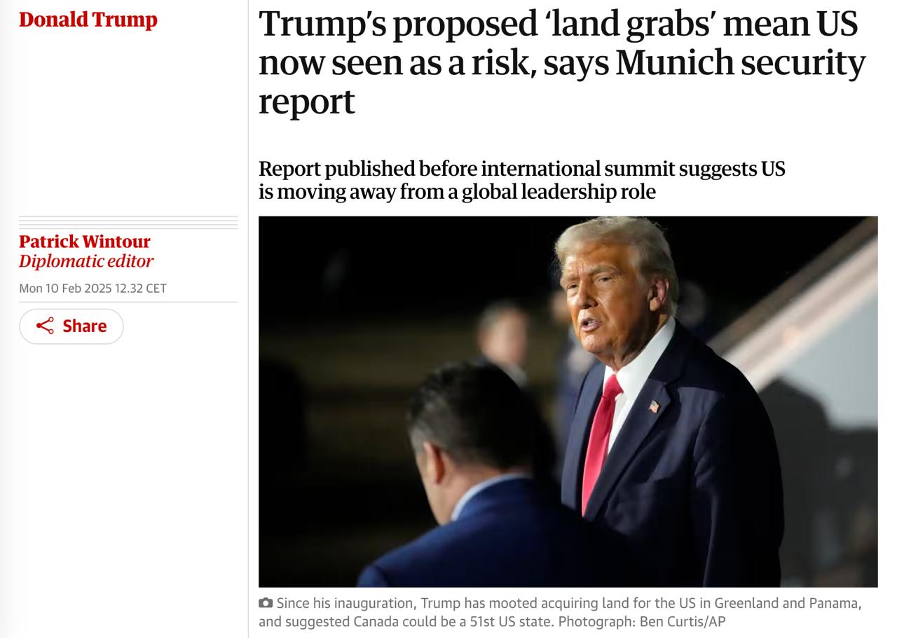 Предложенные Трампом "захваты земель" означают, что США теперь не воспринимаются как оплот стабильности - доклад по безопасности