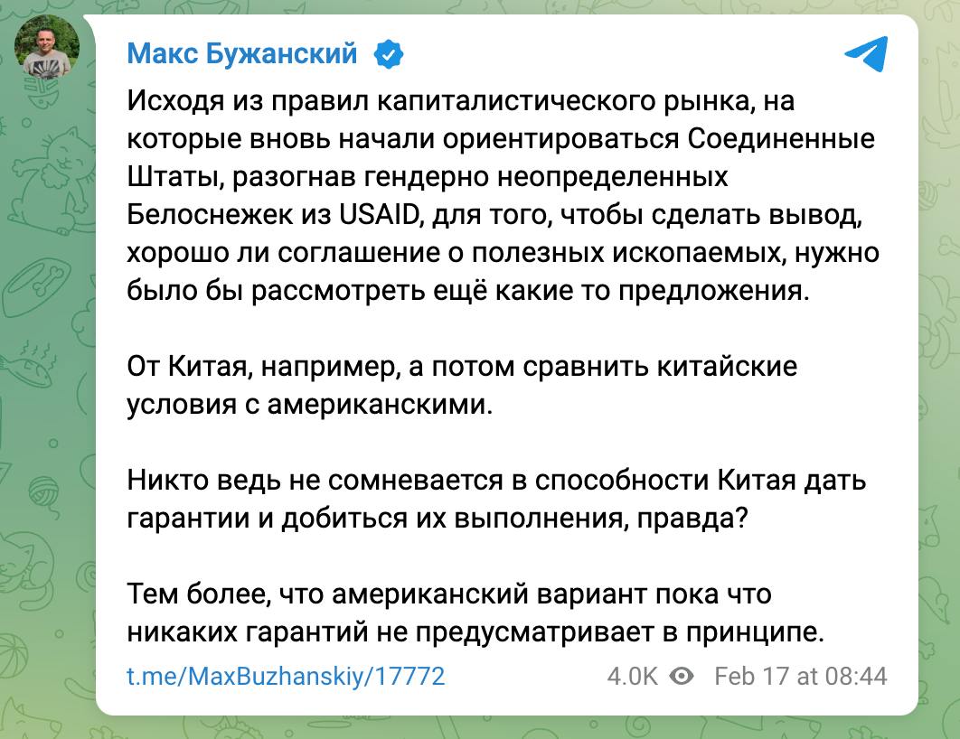 "Для того, чтобы сделать вывод, хорошо ли соглашение о полезных ископаемых, нужно было бы рассмотреть ещё какие-то предложения. От Китая, например, а потом сравнить китайские условия с американскими. Никто ведь не сомневается в способности Китая дать гарантии и добиться их выполнения, правда? Тем более, что американский вариант пока что никаких гарантий не предусматривает в принципе", - считает Бужанский.