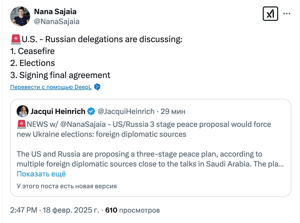 А продюсер Fox News Нана Саджая написала в Х со ссылкой на источники, что США и РФ уже обсуждают приведенный выше план.