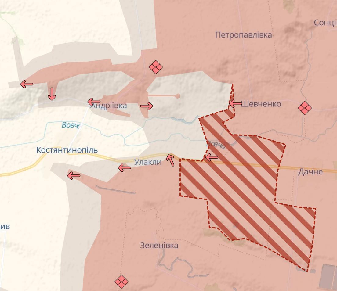 Ранее мы подводили итоги предыдущего дня. Армия РФ в очередной раз существенно продвинулась в "Андреевском мешке" и подошла уже к Константинополю, свидетельствует карта Deep State. К западу от Великой Новоселки россияне захватили половину села Новоселка. Украинские силы выбили армию РФ с трассы из Покровска на Константиновку. Также россияне существенно продвинулись в районе Клещеевки и Андреевки.