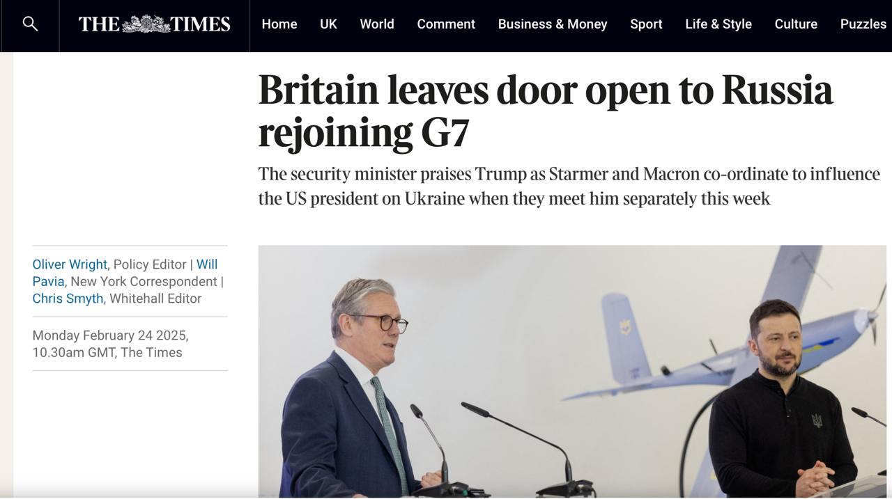 По данным издания, британский министр безопасности Дэн Джарвис не стал исключать вероятности возвращения РФ в G7.