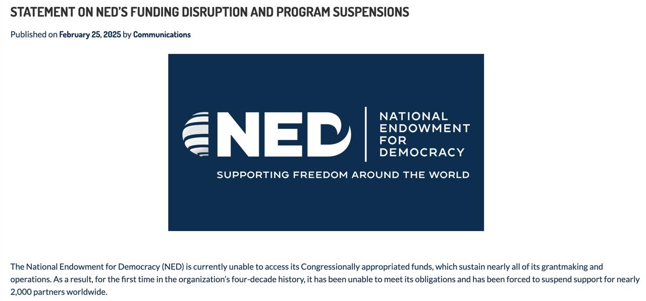 Как сказано в публикации на ее сайте, NED не может получить доступ к выделенным Конгрессом средствам, которыми он оплачивает "почти все" свои гранты и операции.