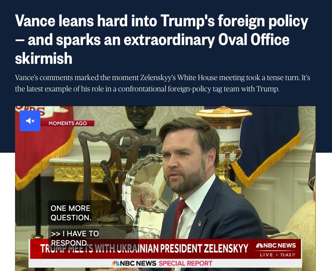 "Конфронтация с Зеленским в пятницу была вызвана не вопросом репортера, а, по словам близких к вице-президенту людей, желанием Вэнса дать отпор тому, что, по его мнению, было неподобающим поведением Зеленского в дипломатической среде", - говорится в статье.