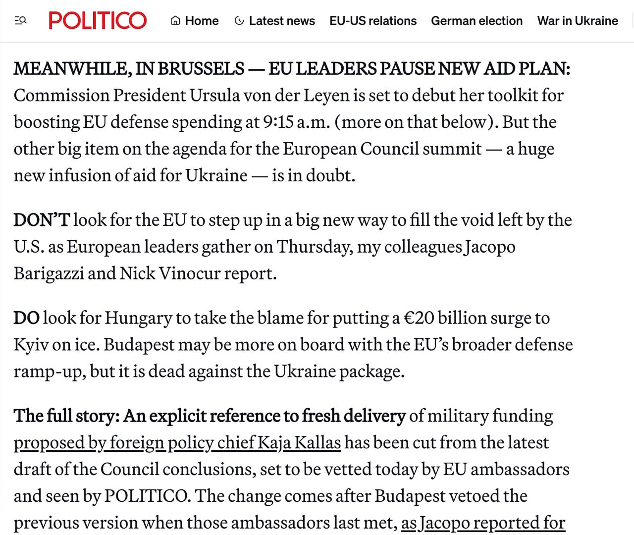 Будапешт поддерживает общий курс ЕС на укрепление обороны, однако выступил категорически против нового пакета помощи Украине.