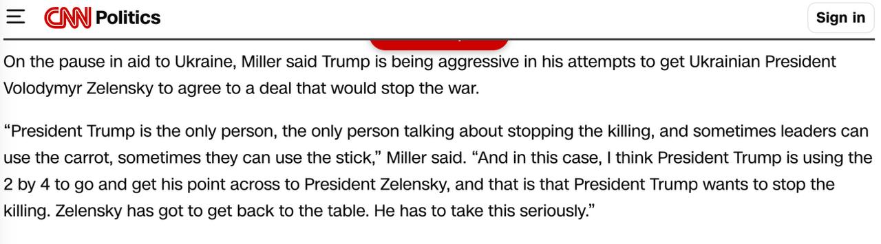Говоря о приостановке помощи Украине, Миллер отметил, что Трамп использовал "кнут" для склонения президента Украины Владимира Зеленского к участию в мирной сделке президента США.