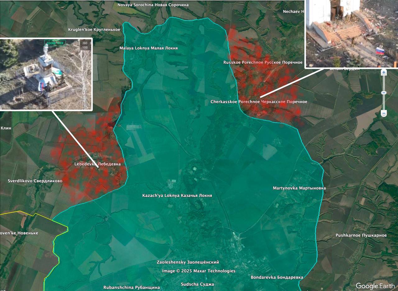 По версии телеграм-канала, Украина частично отошла в Русском и Черкасском Поречном. При этом Лебедевка, по данным паблика, россиянами захвачена полностью (благодаря чему РФ сильно продвинулась к трассе, что ещё более усложняет логистику по ней). В Судже и около нее продвижений не фиксируется.