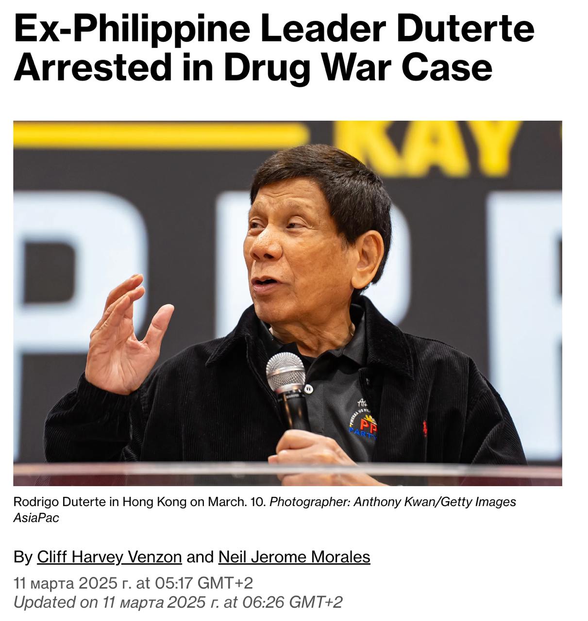 Бывшего президента Филиппин Родриго Дутерте арестовали по ордеру Международного уголовного суда (МУС).
