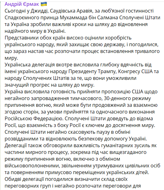 "Украина выразила готовность принять предложение США по немедленному введению временного, 30-дневного режима прекращения огня, который может быть продлен по взаимному согласию сторон, при принятии и одновременном выполнении Российской Федерацией. Соединенные Штаты сообщат РФ, что взаимность со стороны России является ключом к достижению мира. Соединенные Штаты немедленно отменяют паузу в обмене разведданными и восстанавливают помощь в безопасности Украины", - написал Ермак по итогам переговоров в Саудовской Аравии.