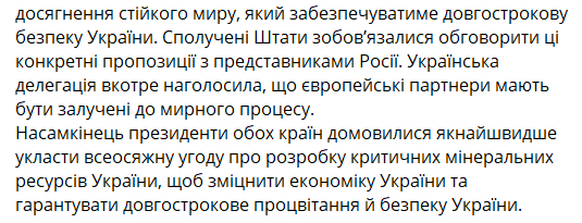 "Обе делегации согласились определить состав своих переговорных групп и немедленно начать переговоры для достижения устойчивого мира, обеспечивающего долгосрочную безопасность Украины. Соединенные Штаты обязались обсудить эти конкретные предложения с представителями России. Украинская делегация в очередной раз подчеркнула, что европейские партнеры должны быть вовлечены в мирный процесс. В конце концов, президенты обеих стран договорились как можно быстрее заключить всеобъемлющее соглашение о разработке критических минеральных ресурсов Украины, чтобы укрепить экономику Украины и гарантировать долгосрочное процветание и безопасность Украины", - добавил глава Офиса президента.