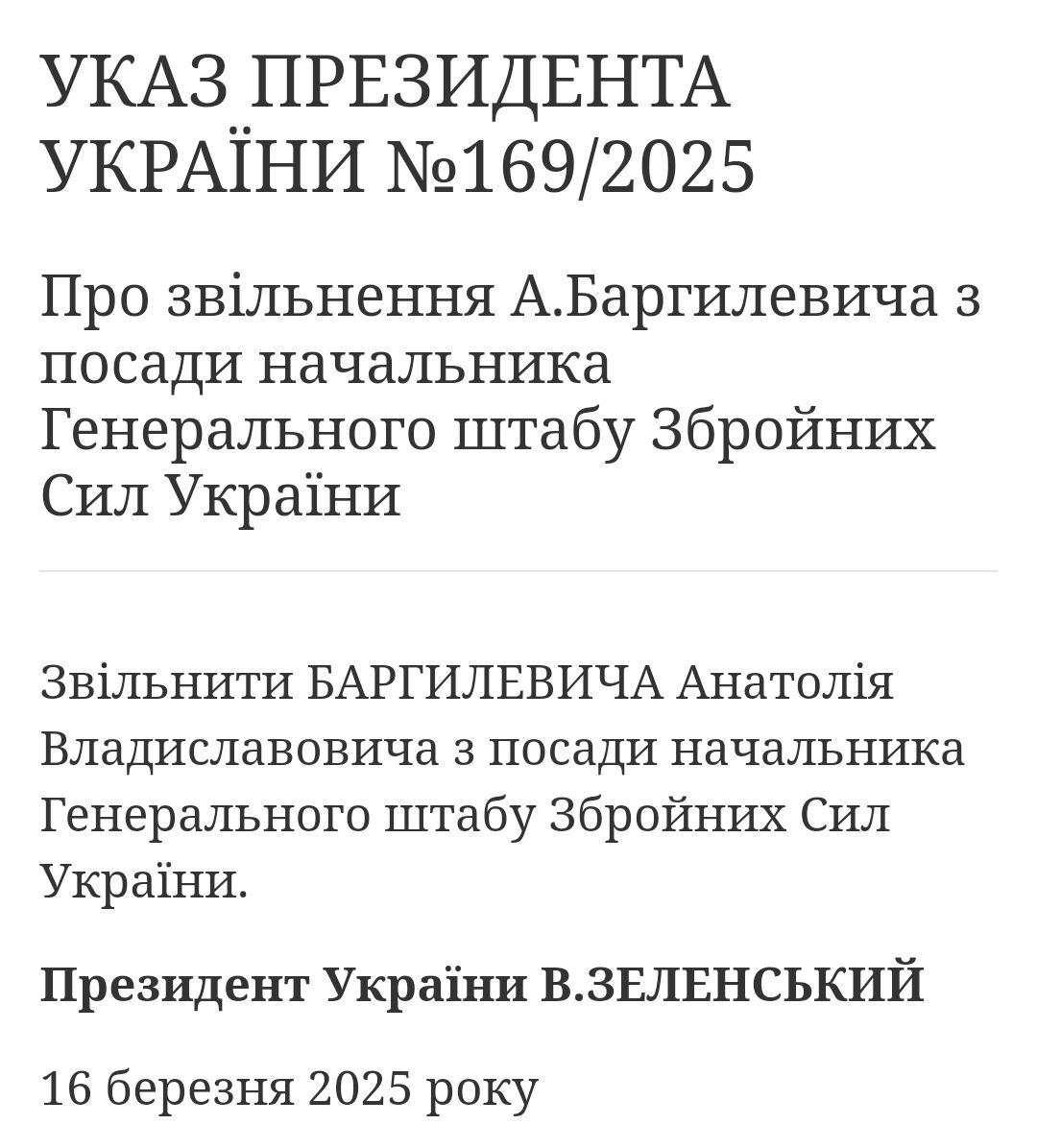 Президент Украины Владимир Зеленский уволил с должности главу Генерального штаба Вооруженных сил Украины Анатолия Баргилевича.