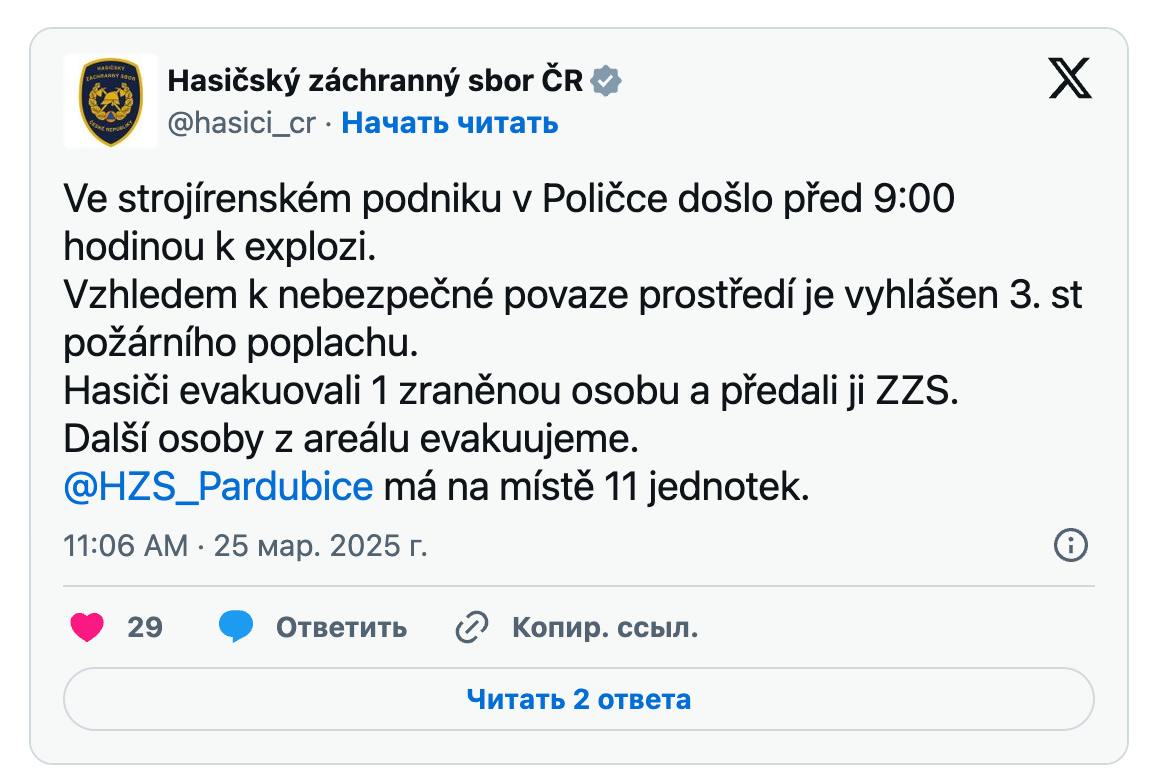 "Я могу подтвердить, что произошел взрыв. Была объявлена ​​пожарная тревога третьего уровня", — сообщила пресс-секретарь пожарной охраны города Вендула Горакова.