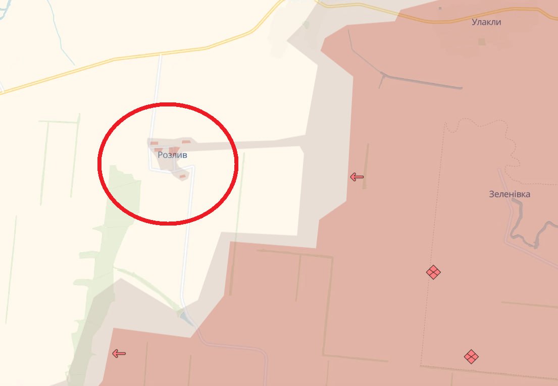 "Наших в селе нет, противник закрепился и установил тряпку (флаг РФ - Ред.) в центральной и западной частях села. Разлив находится под полным контролем врага, кроме юго-западной промки (серая зона), дальше уже рубежи нашей обороны", – написал он.