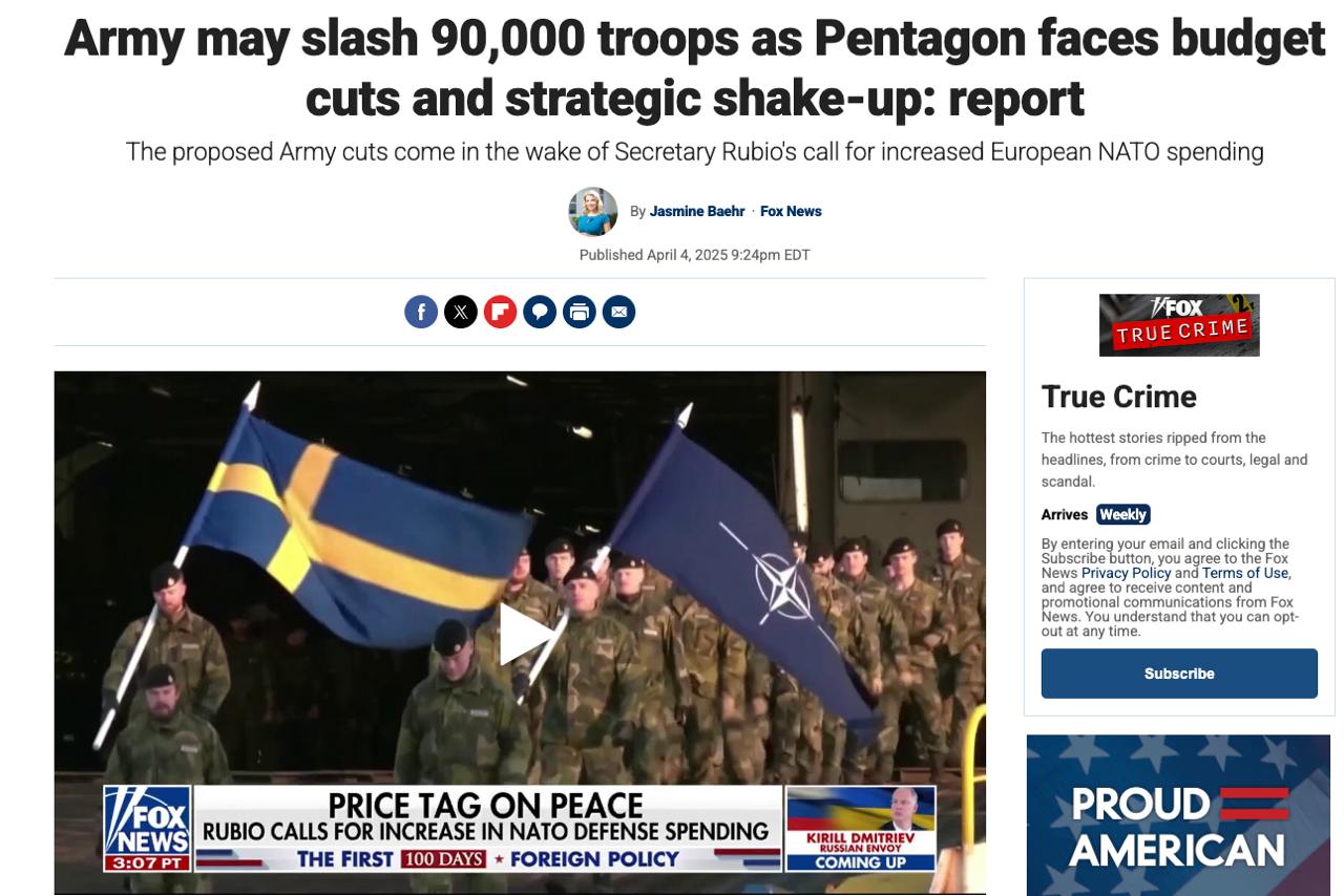 Телеканал Fox News напоминает, что министр обороны Соединенных Штатов Пит Хегсет добивается сокращения бюджета Пентагона на 8%, а армия при этом смещает акцент с европейского направления на контртеррористические задачи. В Пентагоне ожидают, что армия станет "более компактной, высокотехнологичной и мобильной".