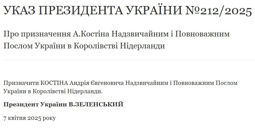 "Назначить Костина Андрея Евгеньевича чрезвычайным и полномочным послом Украины в Королевстве Нидерланды", - говорится в документе.