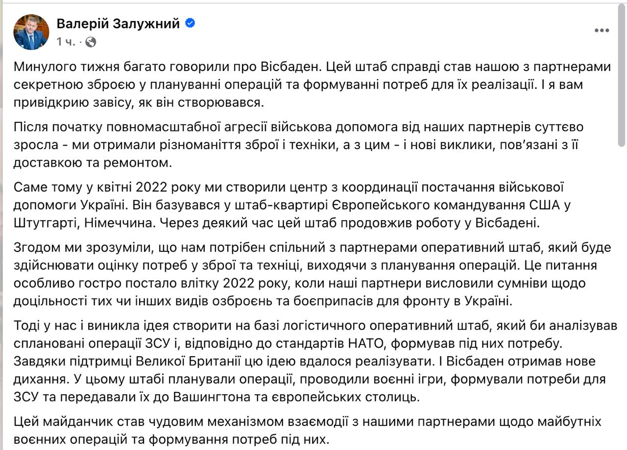 "В этом штабе планировали операции, проводили военные игры, формировали потребности для ВСУ и передавали их в Вашингтон и европейские столицы. Эта площадка стала отличным механизмом взаимодействия с нашими партнерами по поводу будущих военных операций и формирования потребностей под них", - пишет бывший главком.